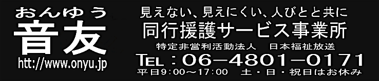 同行援護サービス事業所 音友特定非営利活動法人 日本福祉放送〒534-0026 大阪市都島区網島町4-12 TEL:06-4801-0171 FAX:06-4801-7401 E-mail:info@onyu.jp | 営業時間 月曜日〜金曜日 9:00〜17:00 (土・日・祝日は休日) |